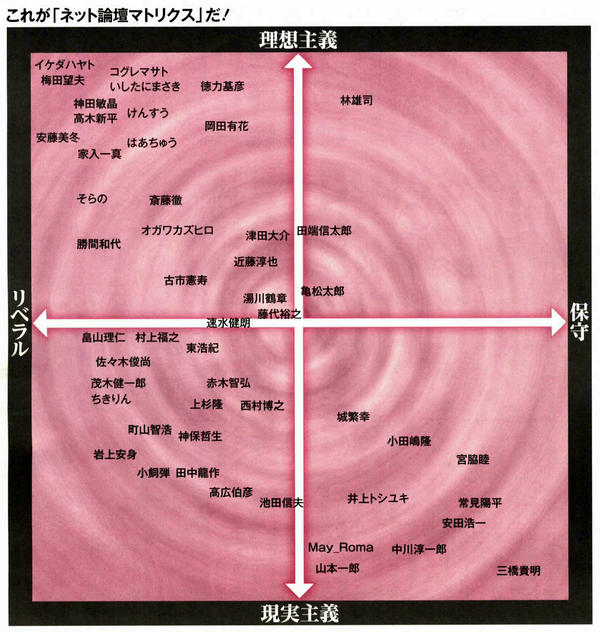 つまり「ネット論壇マトリクス」は、左上ゾーンを作るという目的が先にあり、その象徴として梅田望夫、後継者としてのイケダハヤトを最も左上に入れた。そのうえでネットの可能性を「既存メディア」で説いたアルファブロガー・ノマド界隈を適当に散りばめただけなので横軸がほとんど意味をなしてない。